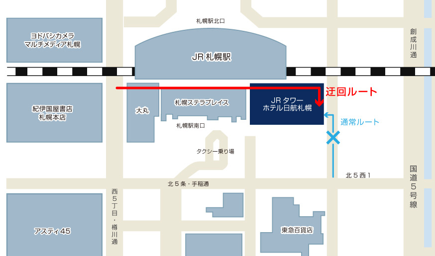 For guests arriving by car, please enter from the parking lot entrance located on the west side of Sapporo Station (near Daimaru Sapporo) and proceed to the hotel’s main entrance.