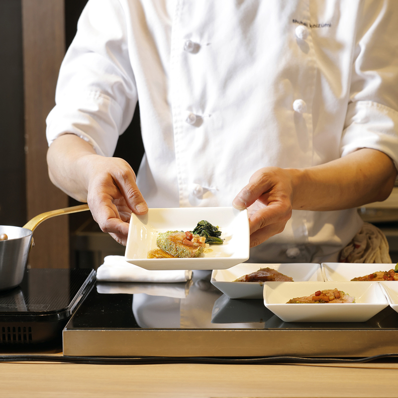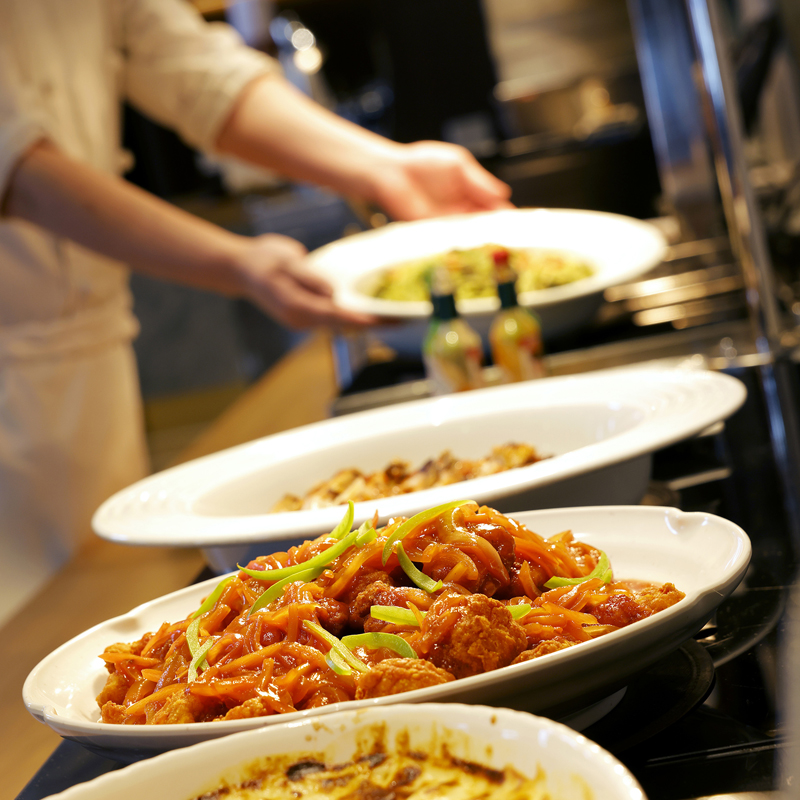 実演コーナーでは、香ばしく焼き上げた「サーロインのロースト 山わさび添え」や、芳醇な香りが広がる「フォアグラのポワレ トリュフソース」をご用意。