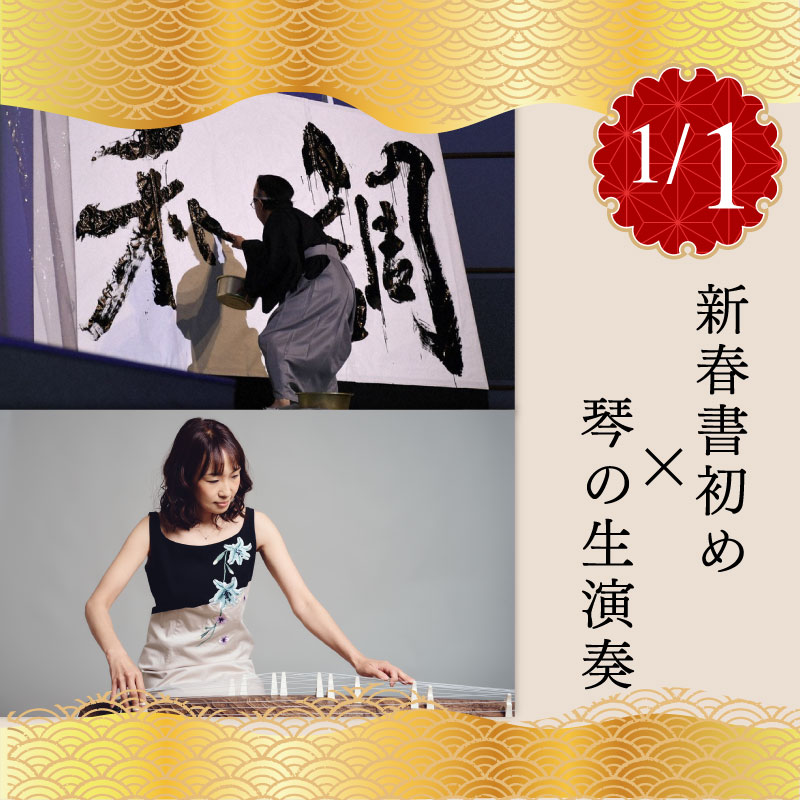 琴の音色とともに、書道家による巨大書初めパフォーマンスを披露いたします。2回に分けて書き上げる四文字の巨大書初めにて、ホテルをご利用の皆様の一年の幸せと健康を願い、その思いを筆に託します。