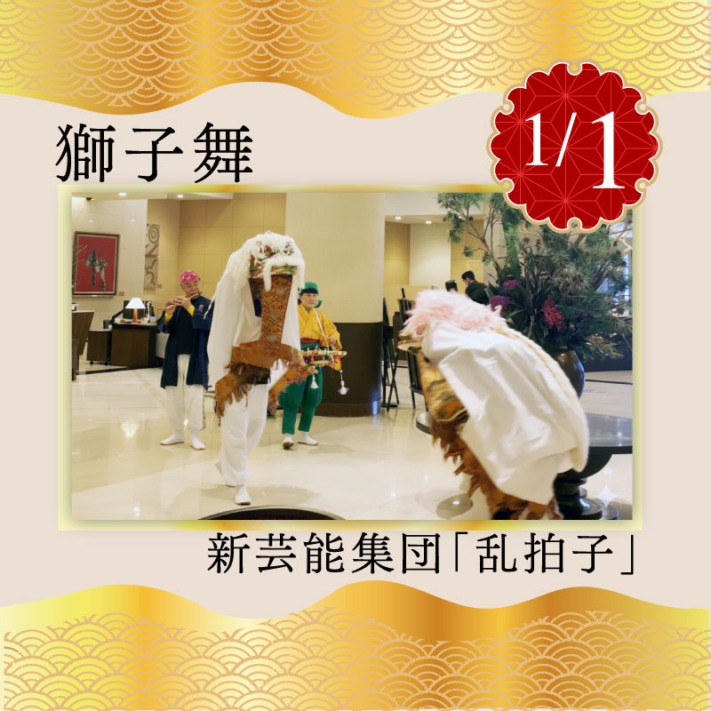 澄んだ琴の音色がロビーに広がる中、書道家による迫力の巨大書初めが披露され、ホテル各所では躍動感あふれる獅子舞もご覧いただけます。